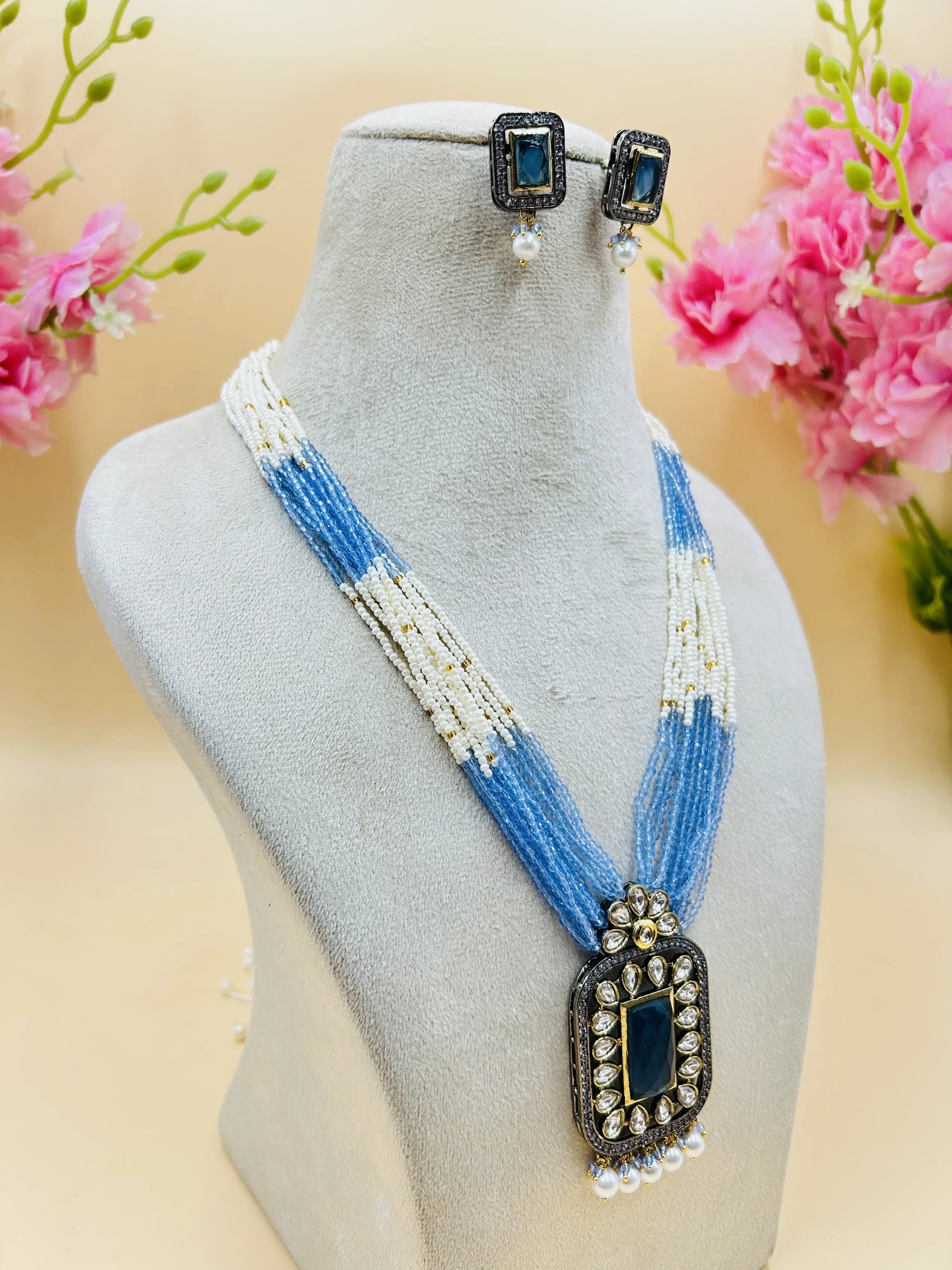 This Bead Jadau Kundan Necklace Set has been expertly designed with intricate beadwork and stunning Kundan embellishments. The combination of these features creates a timeless and elegant piece perfect for any occasion. The detailed craftsmanship and high-quality materials ensure a beautiful and durable accessory for years to come.