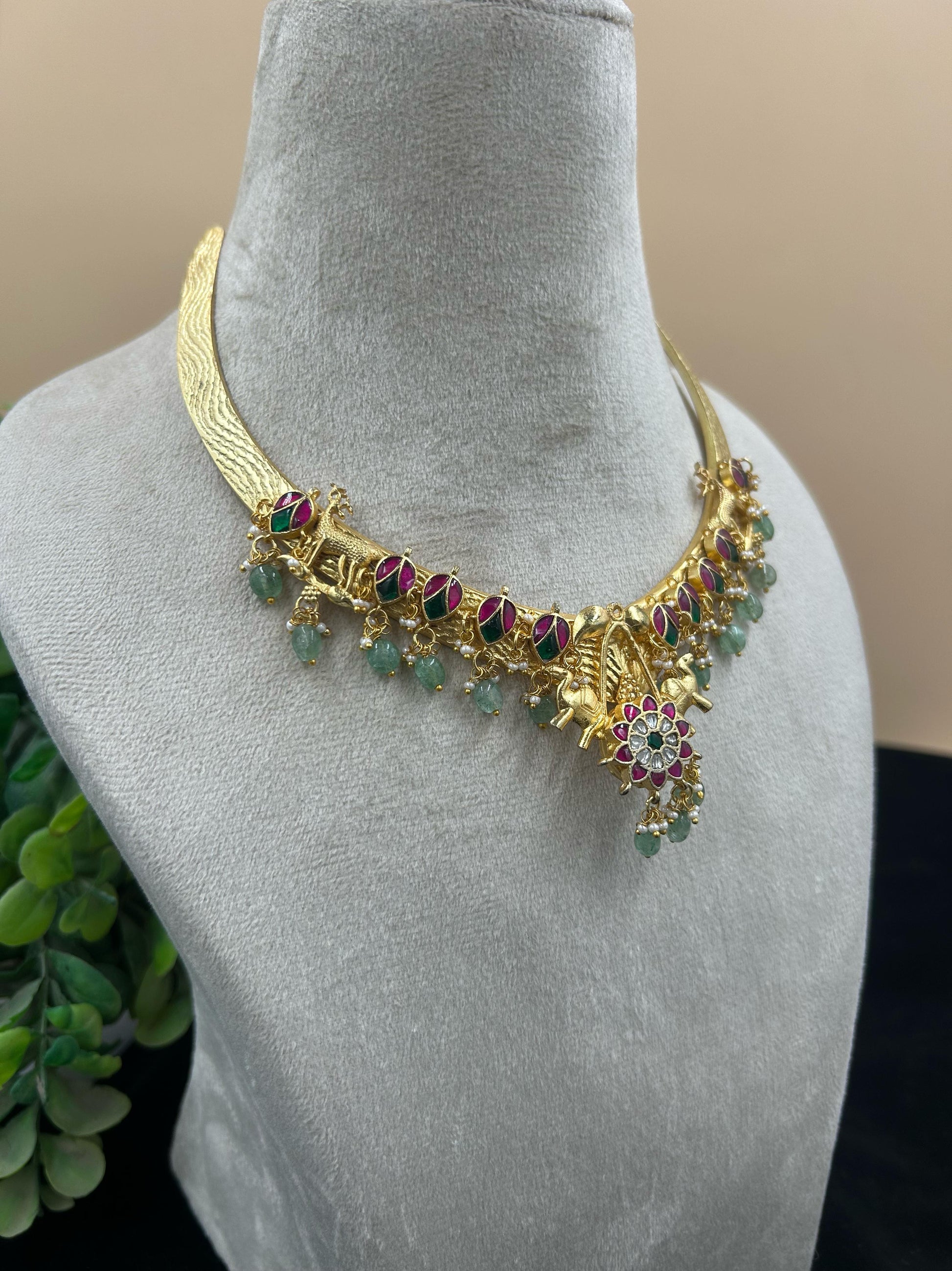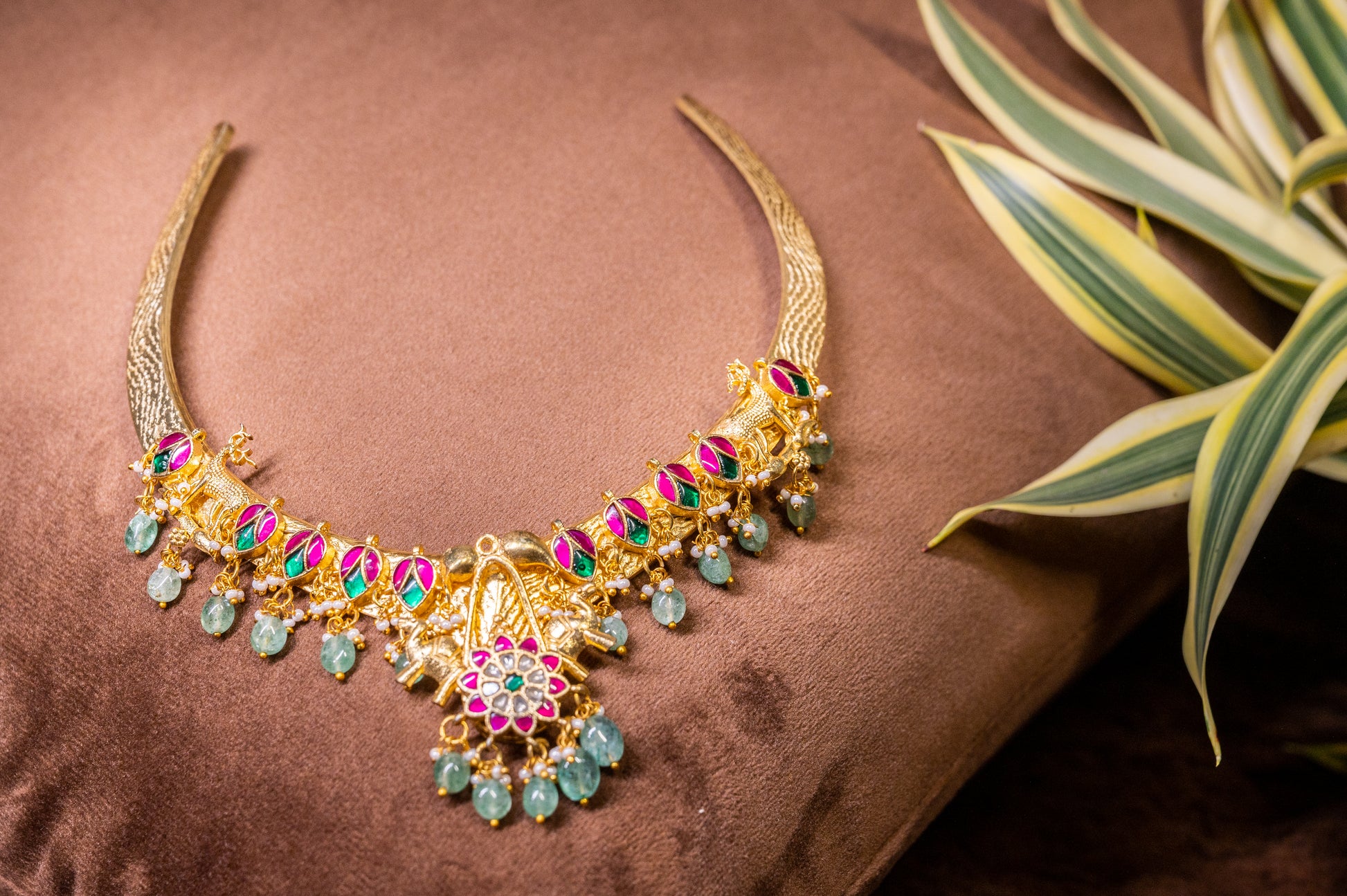 Handcrafted by skilled Jaipur artisans, the choker features intricate kundan stonework set in a rich golden base. Delicate meenakari enamel adds vibrant colour, while the matching haram extends below with coordinated motifs and soft bead drops that move beautifully as you do.