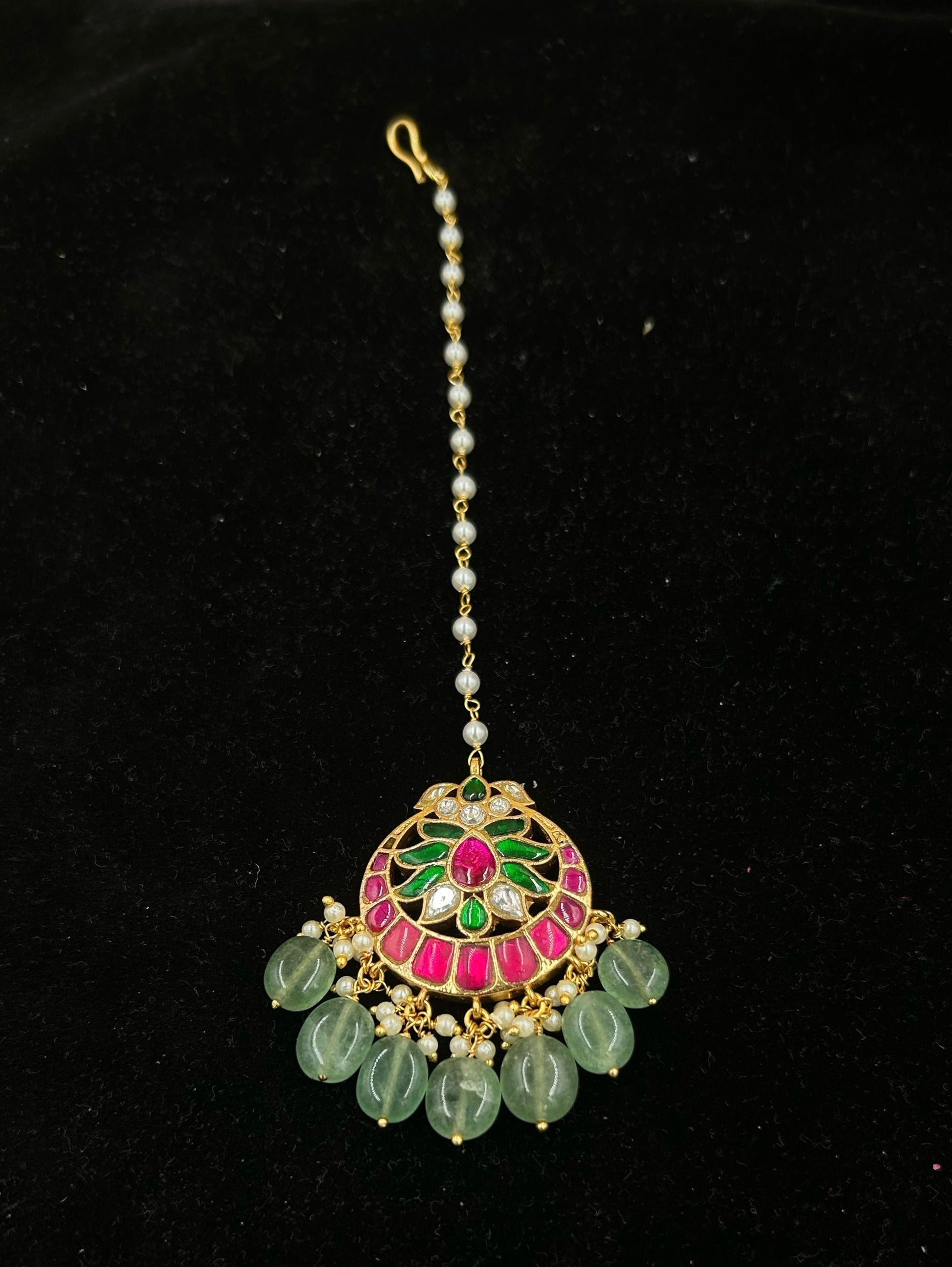 Let your forehead shine with heritage and elegance. The Meenakari Maang Tika with Green Beads is not just a jewellery piece, it's a celebration of Jaipur's royal craft, made for the modern Indian woman who loves her roots.